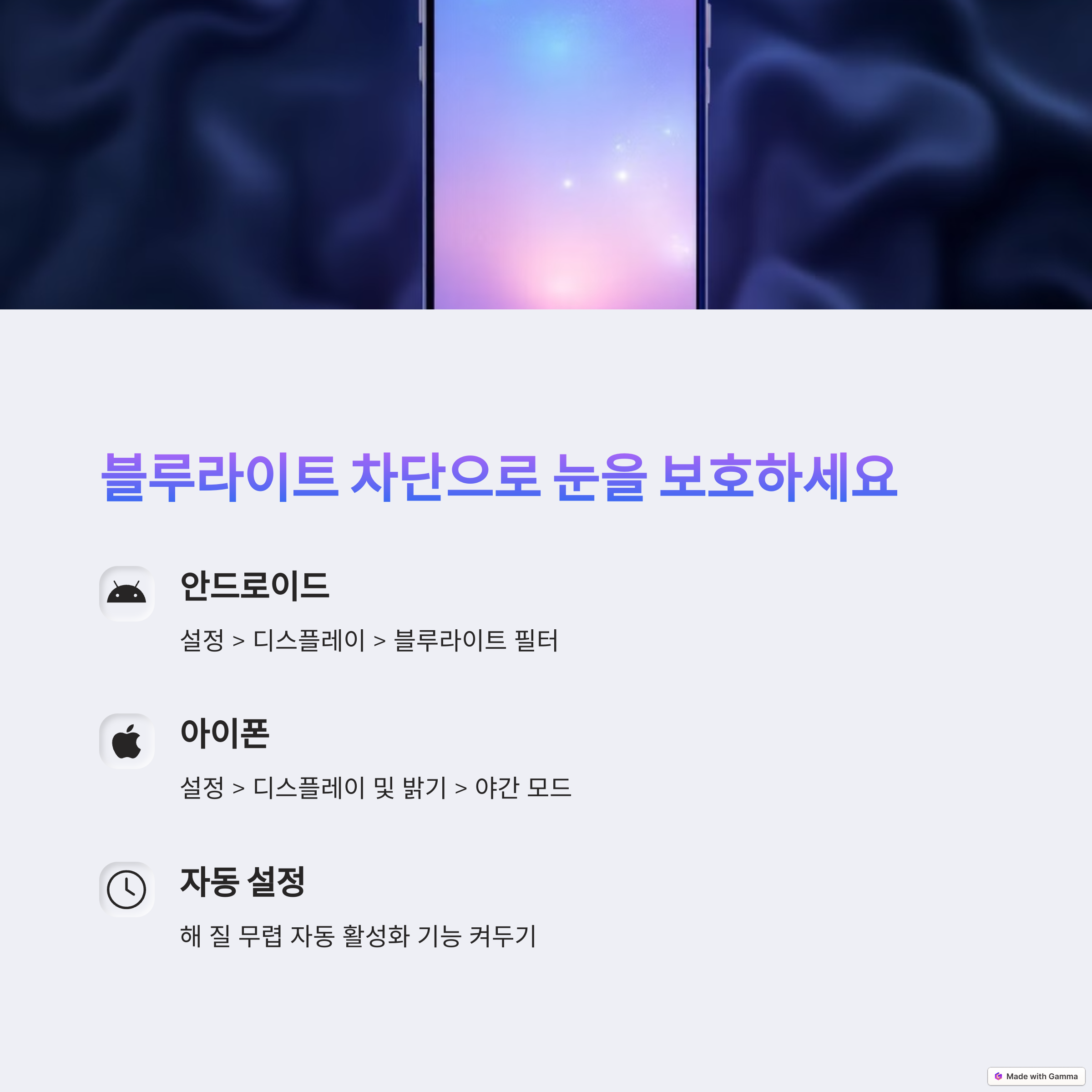 | 블루라이트 차단 | 밝기 조절 | 사용 시간 관리 |