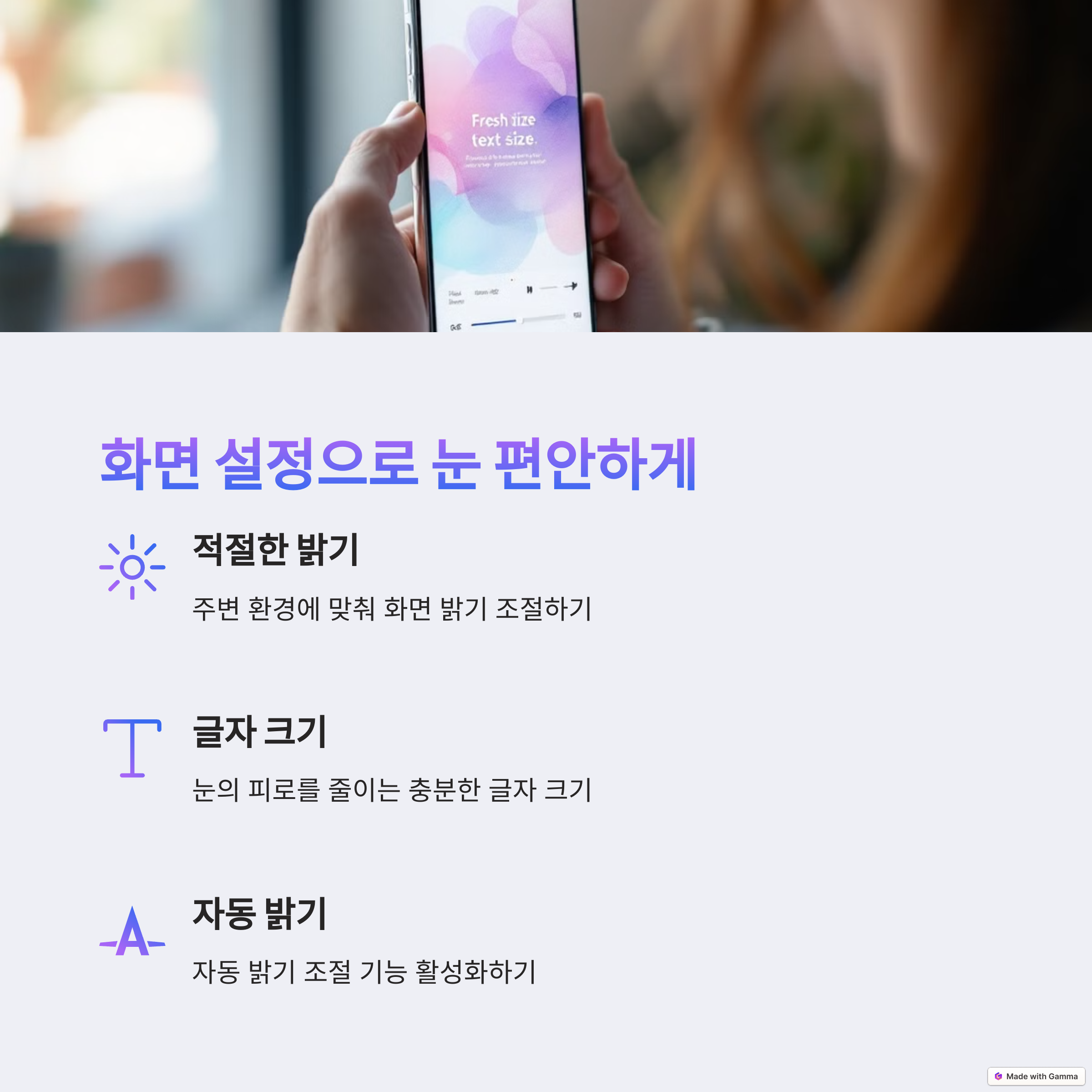 스마트폰 화면의 밝기가 지나치게 높거나 어두울 경우, 눈의 피로를 유발할 수 있습니다. 특히 어두운 환경에서 밝은 화면을 오래 바라보면 눈 근육이 과도하게 긴장하게 되어 시력 저하로 이어질 위험이 큽니다. 따라서 자동 밝기 조정을 활성화하거나 주변 환경에 맞게 적절히 설정하는 것이 중요합니다. 또한 글자 크기를 키워 눈에 가해지는 부담을 줄이는 것도 좋은 방법입니다. 작은 글씨를 오랫동안 읽으면 눈의 조절 능력이 떨어져 근시가 악화될 가능성이 있습니다.