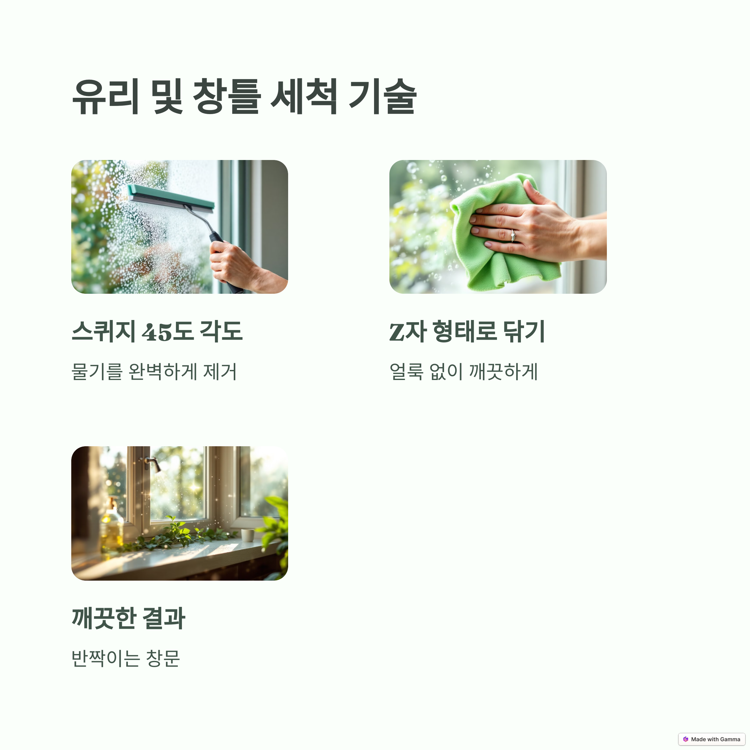 그다음에는 유리 세정제나 중성 세제를 물에 풀어 부드러운 천으로 유리창을 닦아주면 됩니다. 유리 세정제를 사용하면 자국이 남지 않고 깨끗하게 유리창을 청소할 수 있습니다. 유리창을 닦은 후에는 스퀴지를 사용하여 물기를 제거합니다. 스퀴지는 유리창에서 물기를 깨끗하게 제거할 수 있는 도구로, 물기가 자국 없이 깔끔하게 제거됩니다.