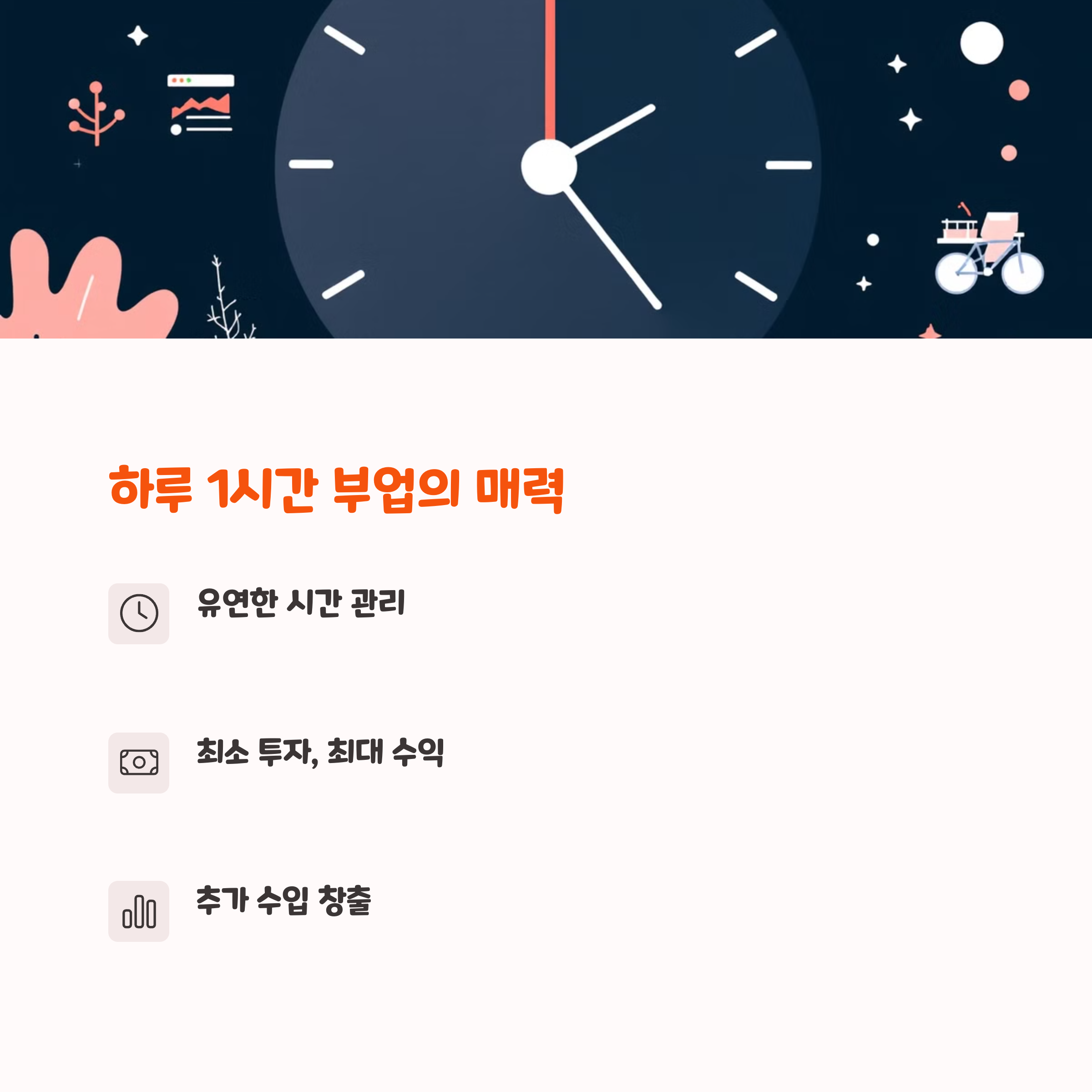 하루 1시간으로 가능한 부업이라면 누구나 관심을 갖지만, 중요한 건 지속 가능성입니다. 처음엔 소소하게 시작하더라도 시간이 쌓이면 월 수익 수십만 원 이상도 충분히 가능합니다. 가장 중요한 건 꾸준함과, 내가 좋아하고 잘할 수 있는 분야를 선택하는 것입니다. 수익보다 만족이 더 중요하다는 사실을 꼭 기억해 주세요.