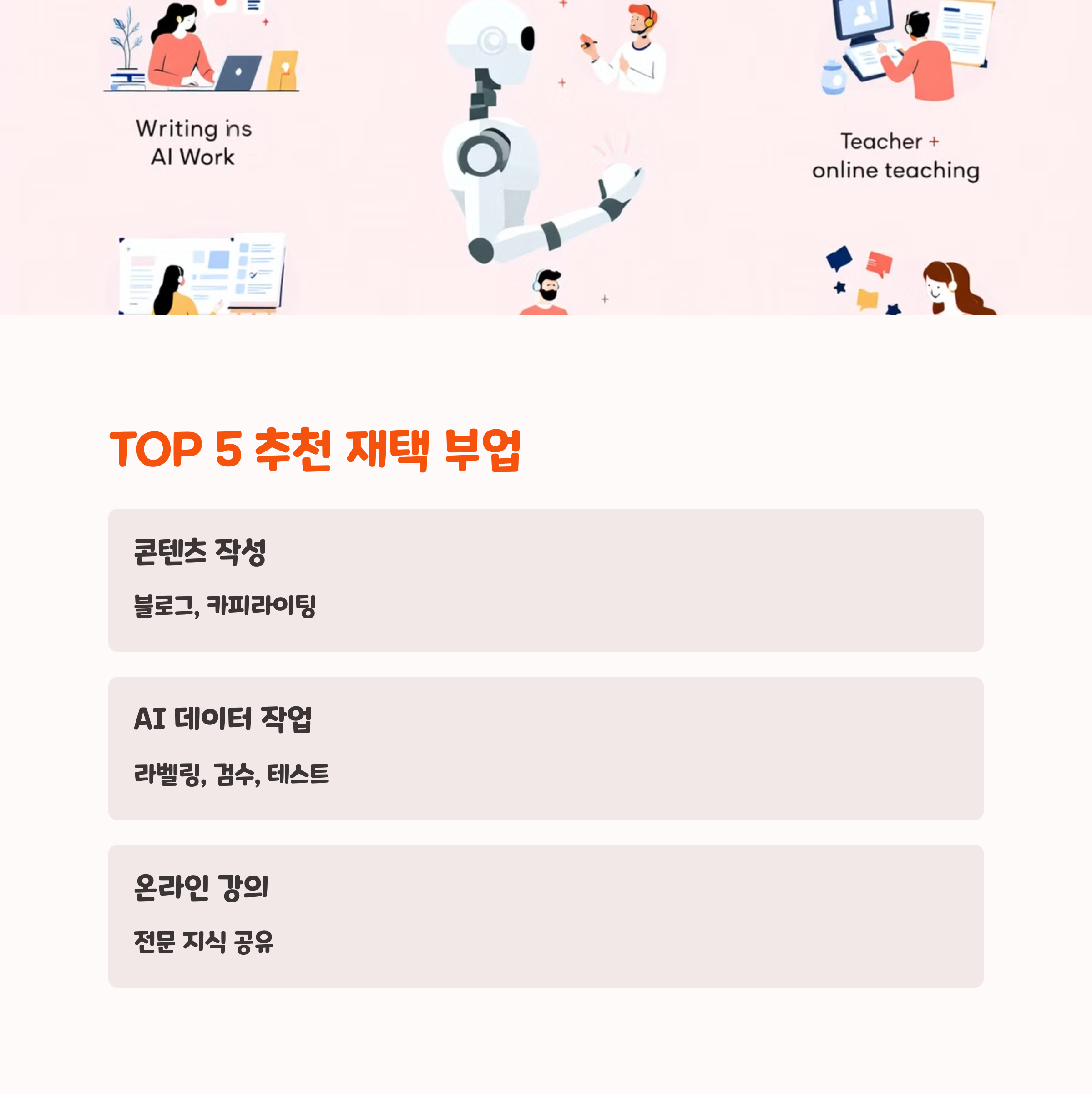 최근 가장 인기 있는 재택 알바로는 블로그 글쓰기, AI 학습 데이터 작업, 온라인 튜터링이 있습니다. 이 세 가지는 진입장벽이 낮고, 하루 1시간 안에서도 꾸준한 수익을 만들 수 있다는 공통점이 있습니다. 특히 글쓰기 부업은 꾸준히 글을 쓴다는 것 자체로 자산이 쌓이는 구조이기 때문에 블로그, 뉴스레터, 콘텐츠 마케팅 등에 활용 가능합니다. 본인이 가진 지식이나 취미를 잘 활용하면 누구나 시작할 수 있는 장점도 있죠.