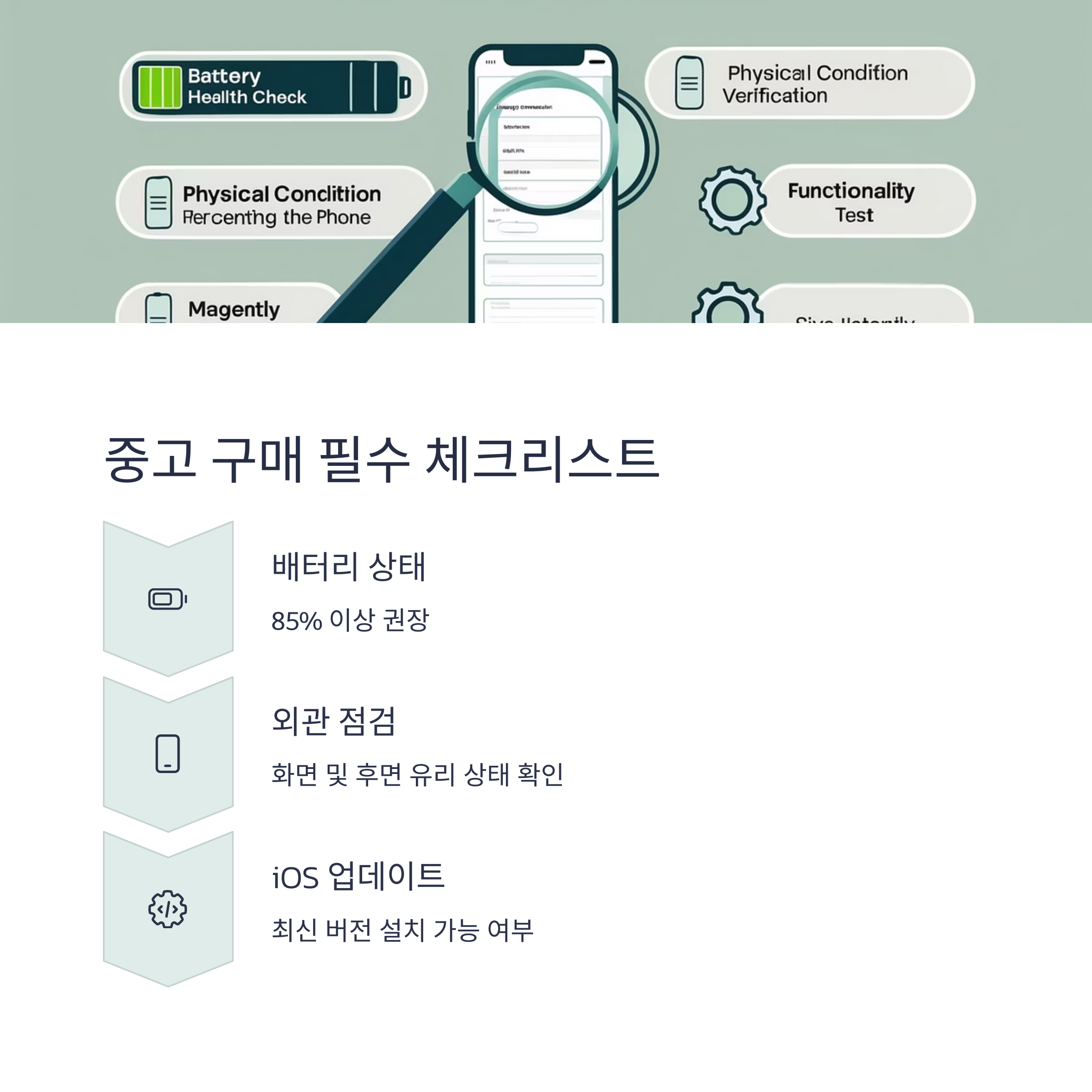 - 배터리 성능(최소 85%), 외관 기스 여부, 수리/리퍼 이력 유무 확인이 중요합니다.