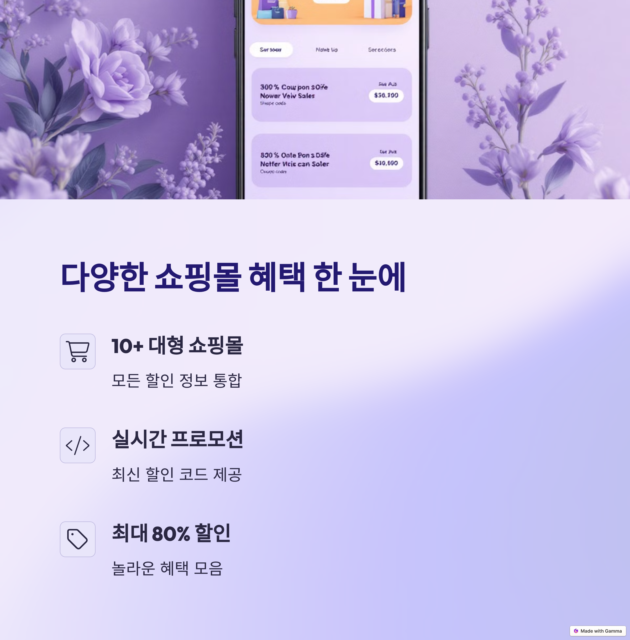 앱을 실행하면, 쇼핑, 음식, 여행 등 여러 카테고리로 나누어진 혜택 목록을 볼 수 있습니다. 사용자는 원하는 카테고리를 선택하여 최신 혜택을 빠르게 확인할 수 있습니다. 각 혜택을 선택한 후, 제공된 할인 코드나 쿠폰을 복사하거나 저장하여 쇼핑몰에서 바로 적용할 수 있습니다.