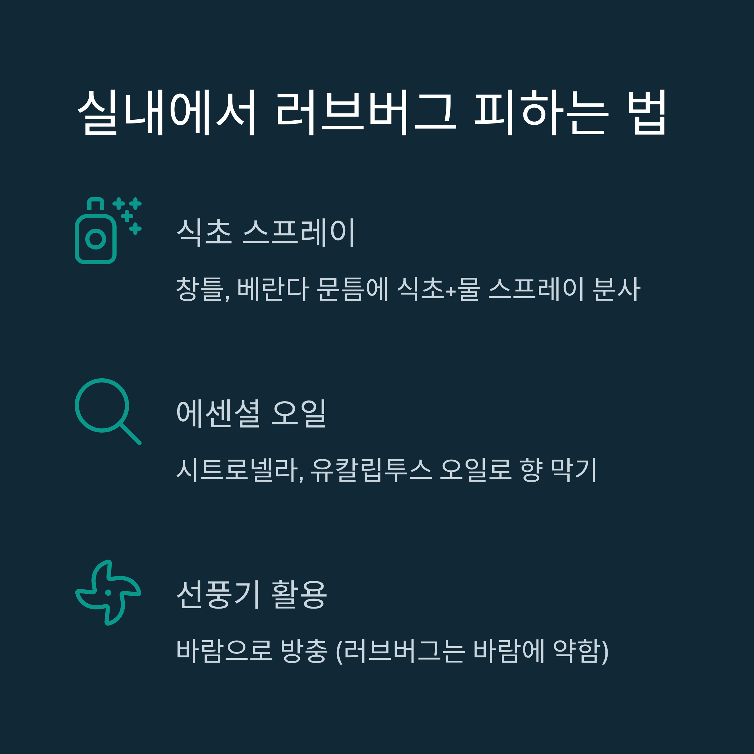 - **에센셜 오일(시트로넬라, 유칼립투스)**로 향 막기