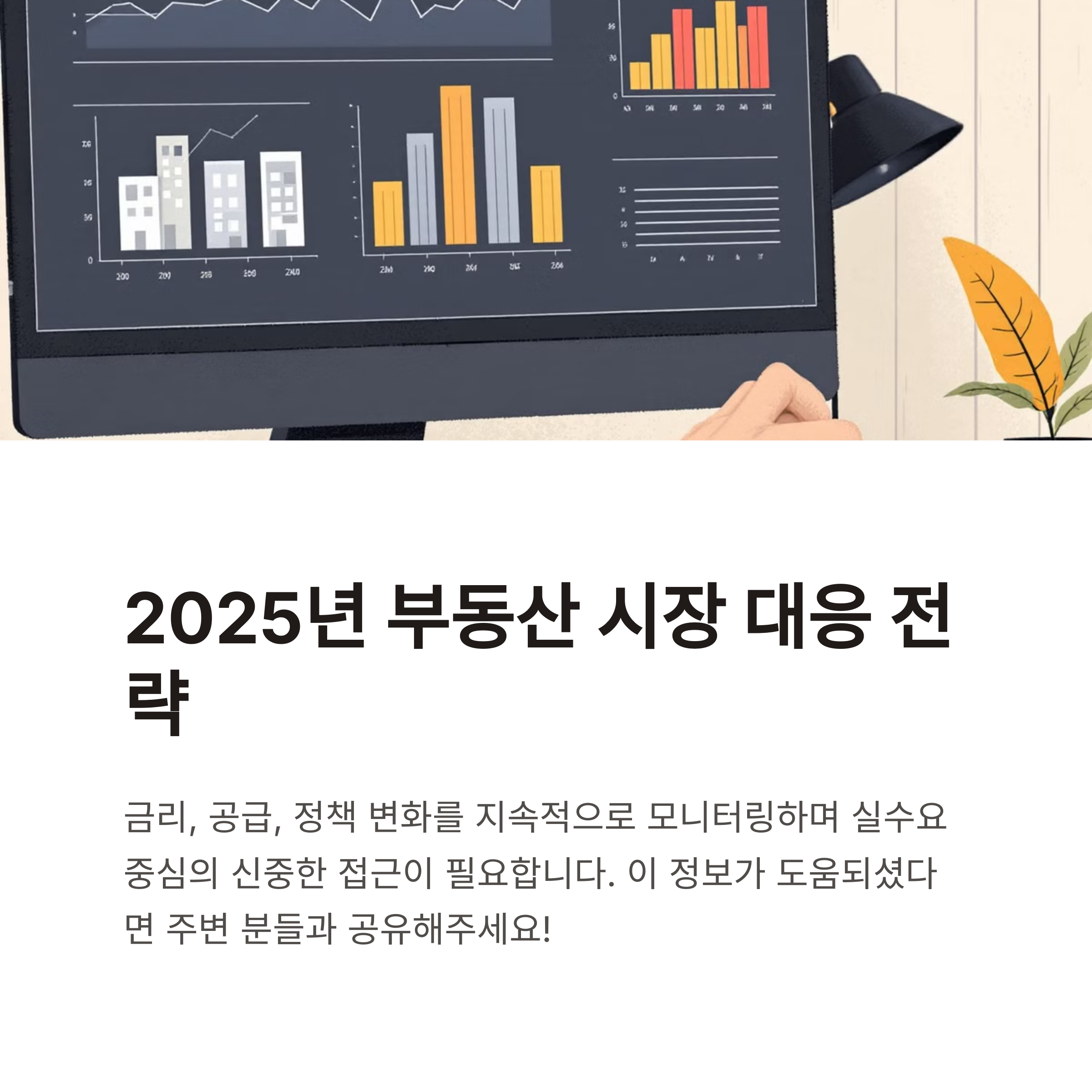 2025년의 부동산 시장은 복잡하고 다양한 요소가 얽혀 있는 시기입니다. 단순한 상승 또는 하락의 흐름보다는 지역별, 수요층 별로 차별화된 움직임이 나타날 가능성이 높습니다. 특히 금리, 공급, 정책 변화 등 각종 지표를 잘 살펴보고 객관적인 데이터 기반 판단이 중요합니다. 오늘의 포스팅이 매수 타이밍을 고민하는 분들께 작은 도움이 되었기를 바랍니다. 언제나처럼 꼼꼼한 분석과 전략이 성공 투자의 열쇠입니다.