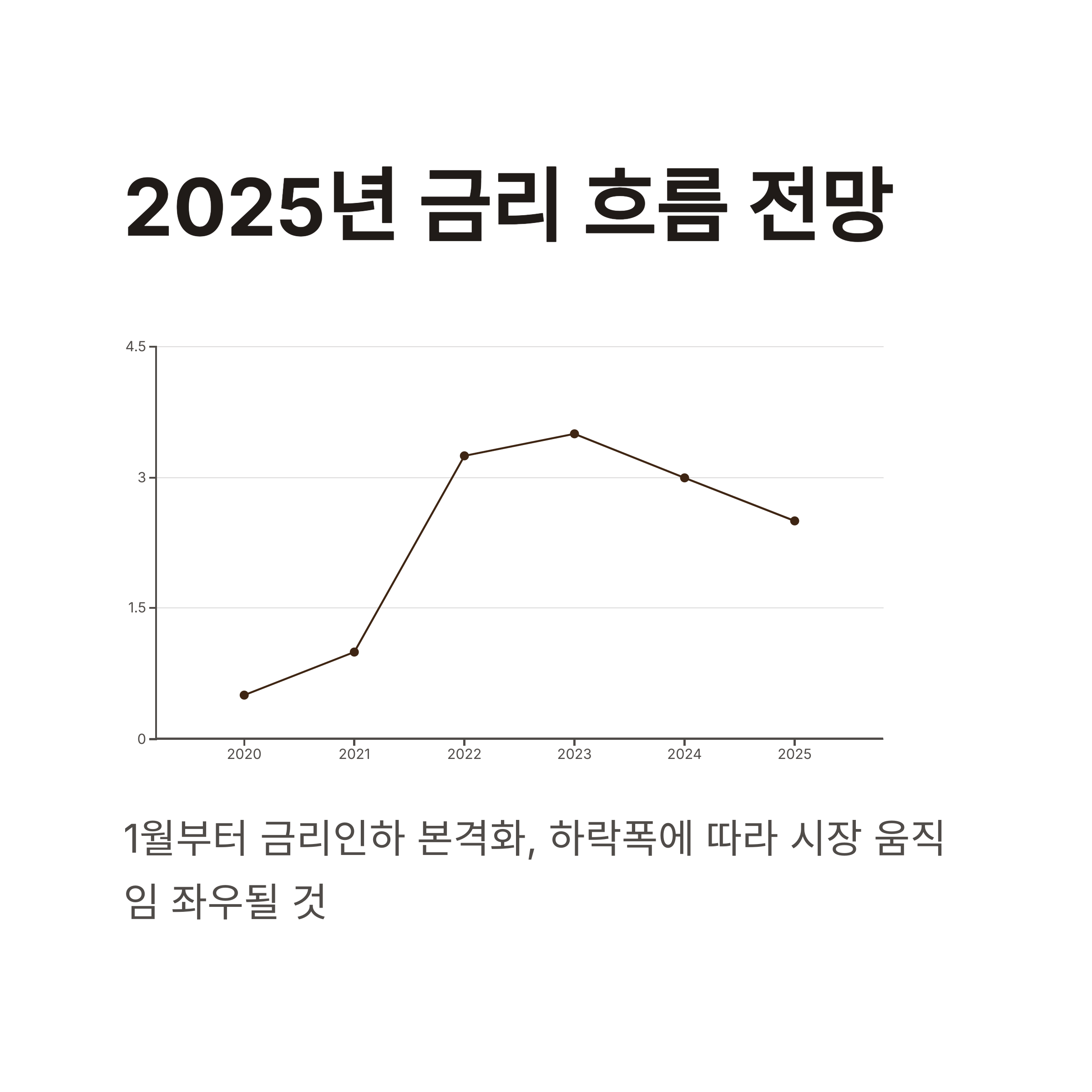 2025년 부동산 시장은 과거와 다른 양상을 보일 것으로 예상됩니다. 가장 큰 변수는 단연코 금리의 방향성입니다. 지난 몇 년간 급격한 금리 인상으로 인해 매수 심리는 크게 위축되었고, 이로 인해 수도권을 포함한 전국 집값은 조정을 받아왔습니다. 하지만 최근 들어 금리 인하에 대한 기대가 커지고 있어, 자산 가격의 반등 가능성도 함께 거론되고 있습니다. 다만 아직 확정적인 흐름은 아니기에, 시장의 눈치를 보는 수요층이 많다는 점도 간과할 수 없습니다.