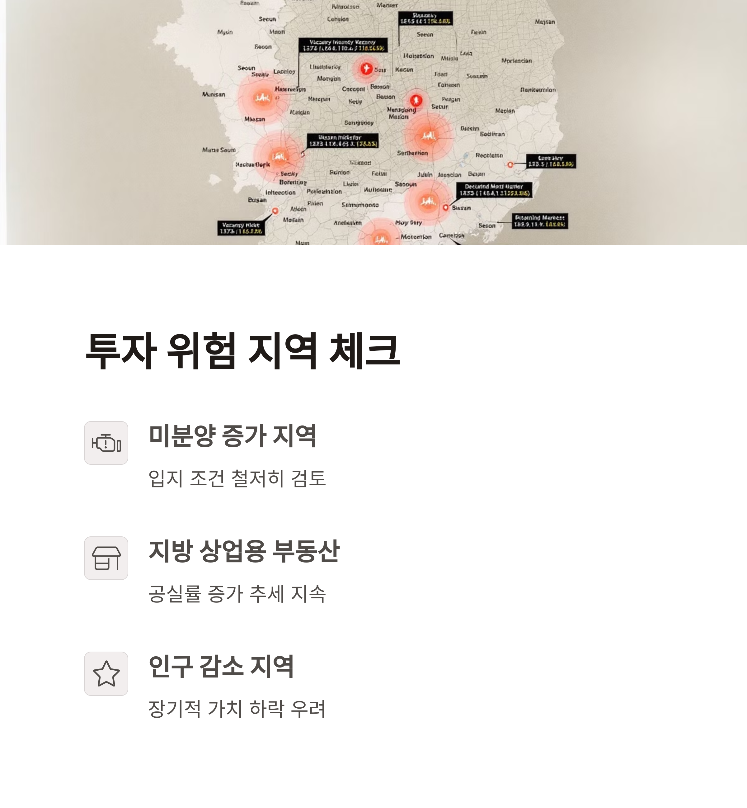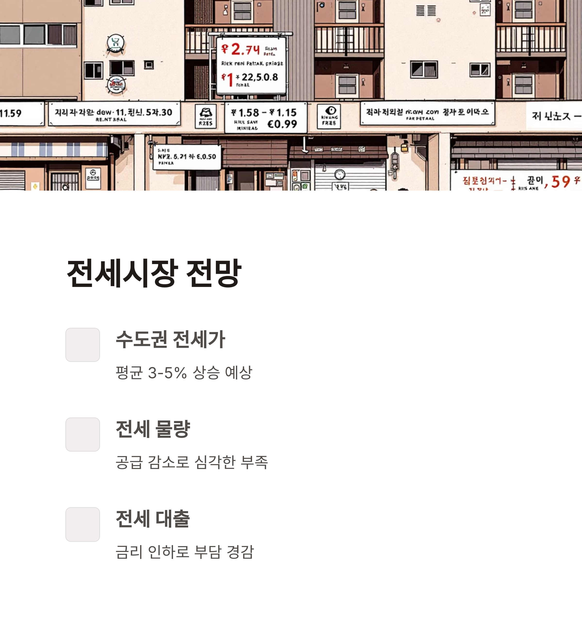 | 하반기까지는 점진적 조정이 이어질 전망입니다. | 일부 지역은 조정 후 반등 가능성도 있습니다. | 자금 계획과 보유 전략이 중요합니다. |